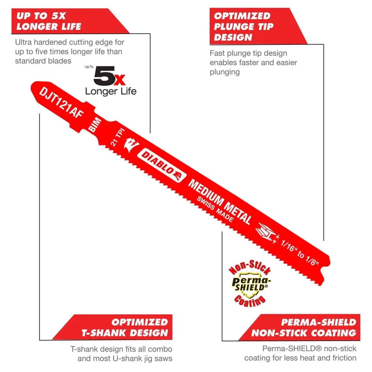 Diablo’s bi-metal teeth jig saw blades are specifically designed for maximum durability, longer life and speed in medium metal applications ranging from 1/16” to 1/8” thickness. These high-performance blades feature an ultra-hardened cutting edge to deliver up to 5X longer life than standard blades. A back taper blade design and Perma-SHIELD® non-stick coating reduces heat and pitch build up for fast and clean cuts in metal. T-shank design fits all combo and most U-shank cordless and corded jig saws.