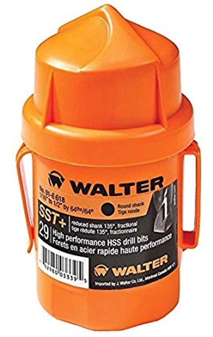 This Walter drill bit set is packaged in a shock resistant, extra-thick polyethylene carrying case. Drill bit sizes are clearly marked on inside panels for quick identification and selection. Metal panels are hinged and fold neatly into box.